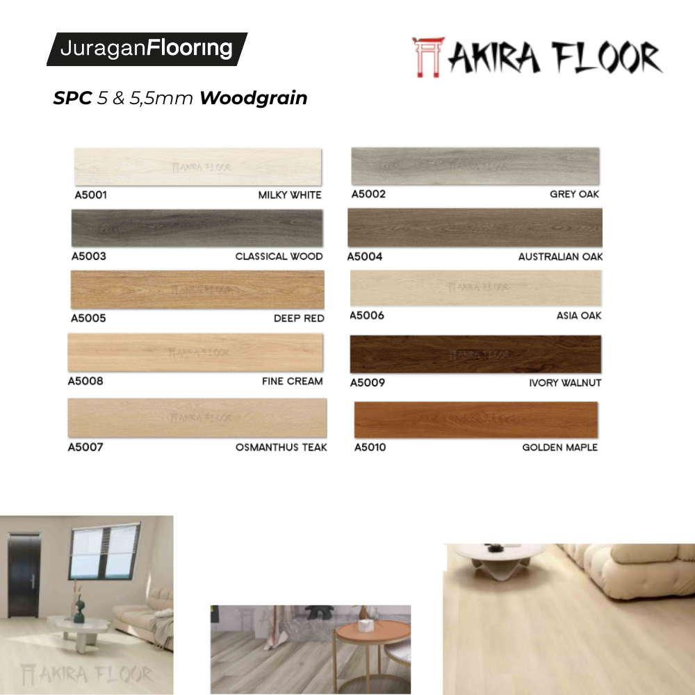 SPC lantai 5mm & 5.5mm dengan motif woodgrain menawarkan tampilan kayu yang natural, kuat, dan premium. Dengan inti batu komposit yang lebih tebal, SPC ini lebih stabil, tahan air 100%, serta tahan terhadap perubahan suhu dan kelembapan. Cocok untuk hunian hingga area komersial.