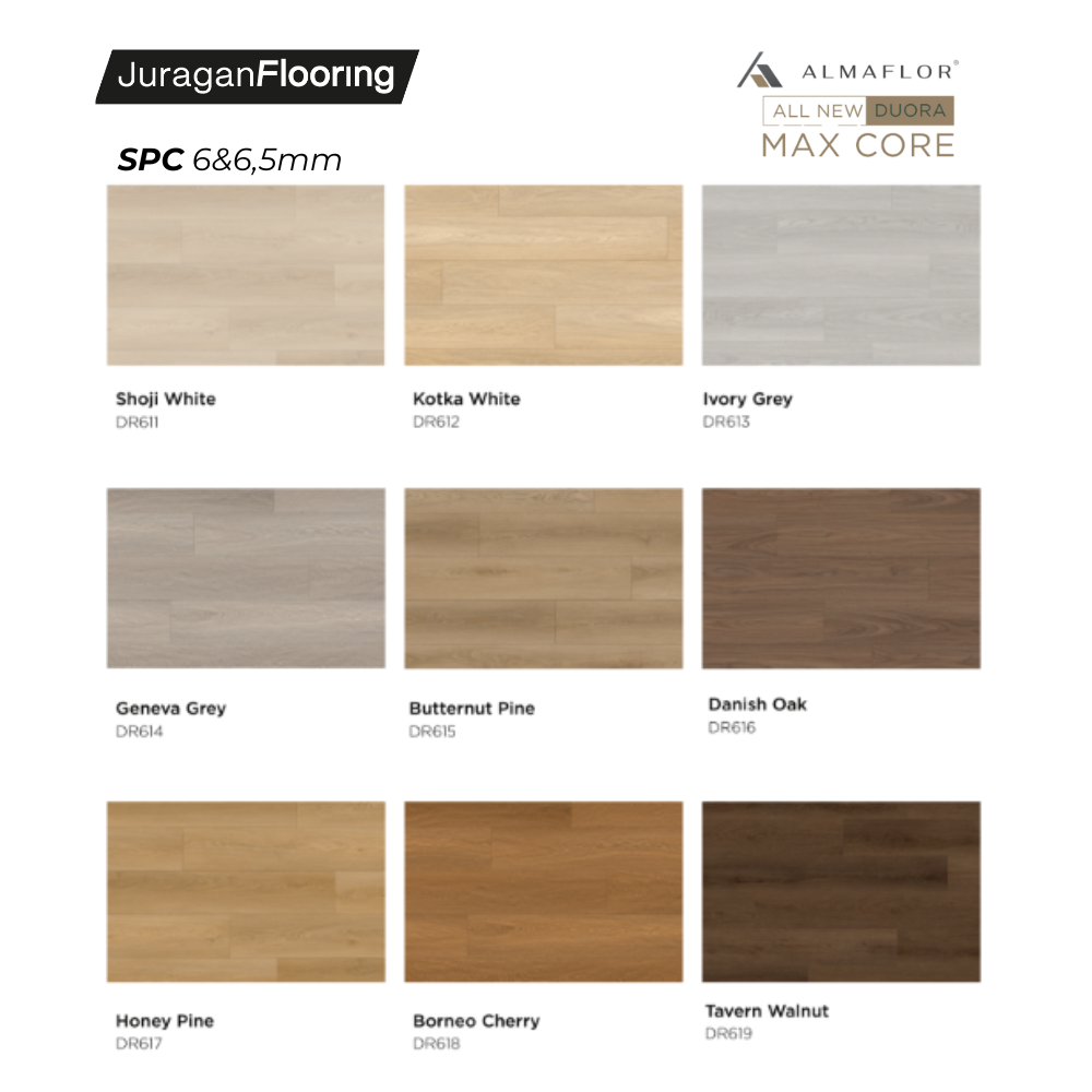SPC lantai 6mm & 6.5mm hadir dengan ketebalan premium yang lebih kokoh, stabil, dan nyaman diinjak. Menggunakan inti batu komposit berkualitas, SPC ini 100% waterproof, tahan gores, dan mampu menahan perubahan suhu serta kelembapan—ideal untuk hunian maupun area komersial.