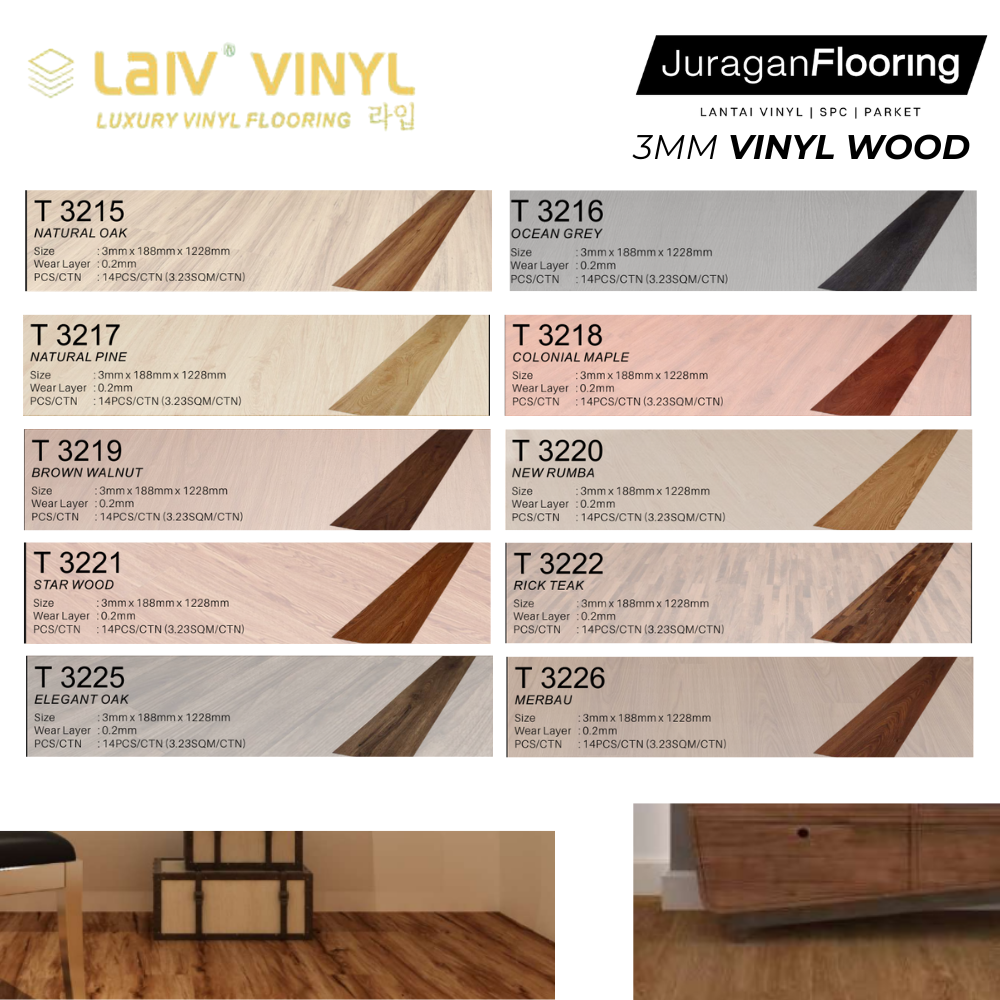 Vinyl lantai 3mm dengan motif woodgrain memberikan tampilan kayu natural dengan ketebalan yang lebih kokoh dan nyaman. Tahan air, tahan gores, serta mudah dibersihkan—cocok untuk rumah, apartemen, kantor, maupun area komersial.