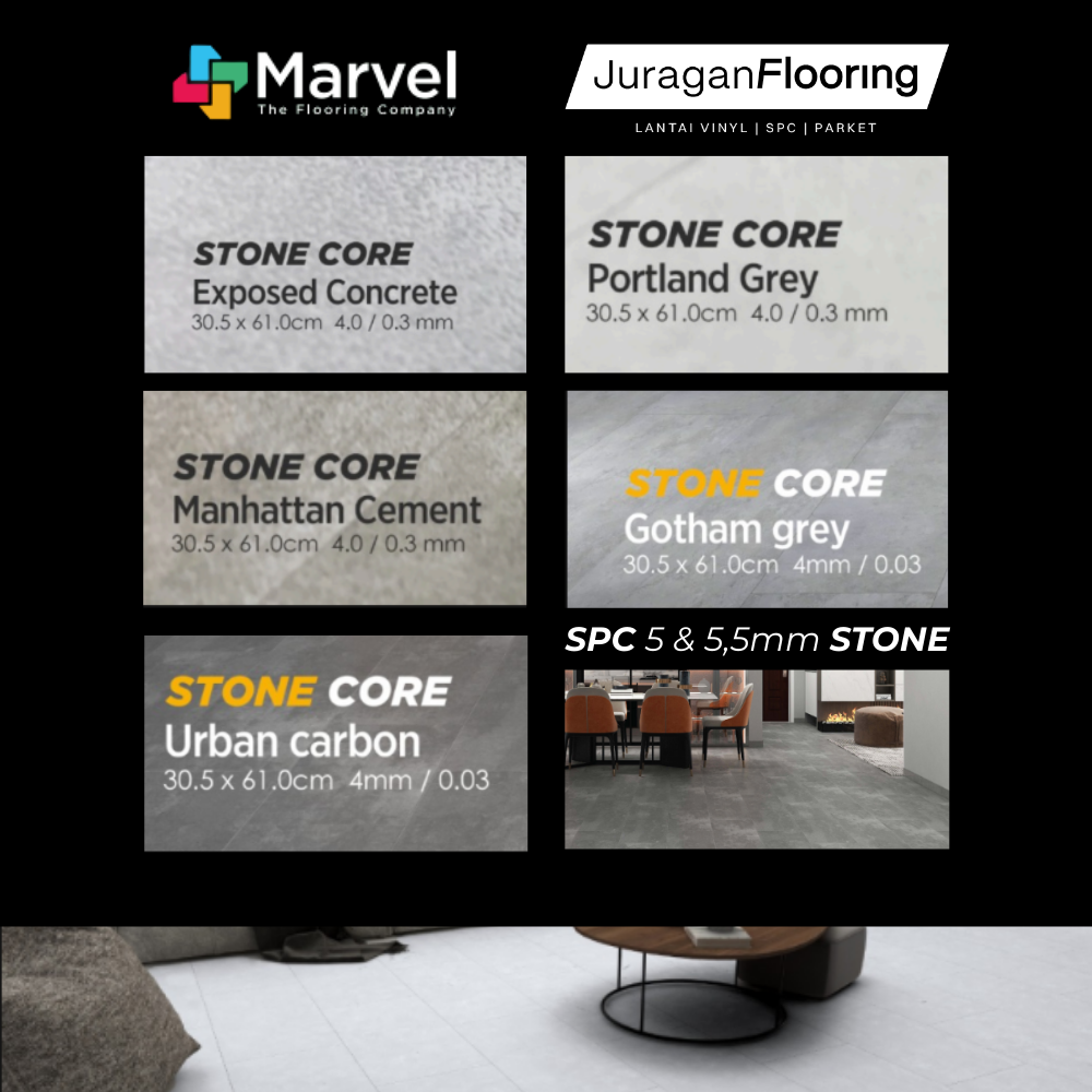 SPC lantai 5mm & 5.5mm motif stone memberikan tampilan batu alami yang modern, elegan, dan kokoh. Dengan inti batu komposit yang tebal, SPC ini sangat stabil, 100% waterproof, tahan gores, serta aman untuk area dengan aktivitas tinggi.